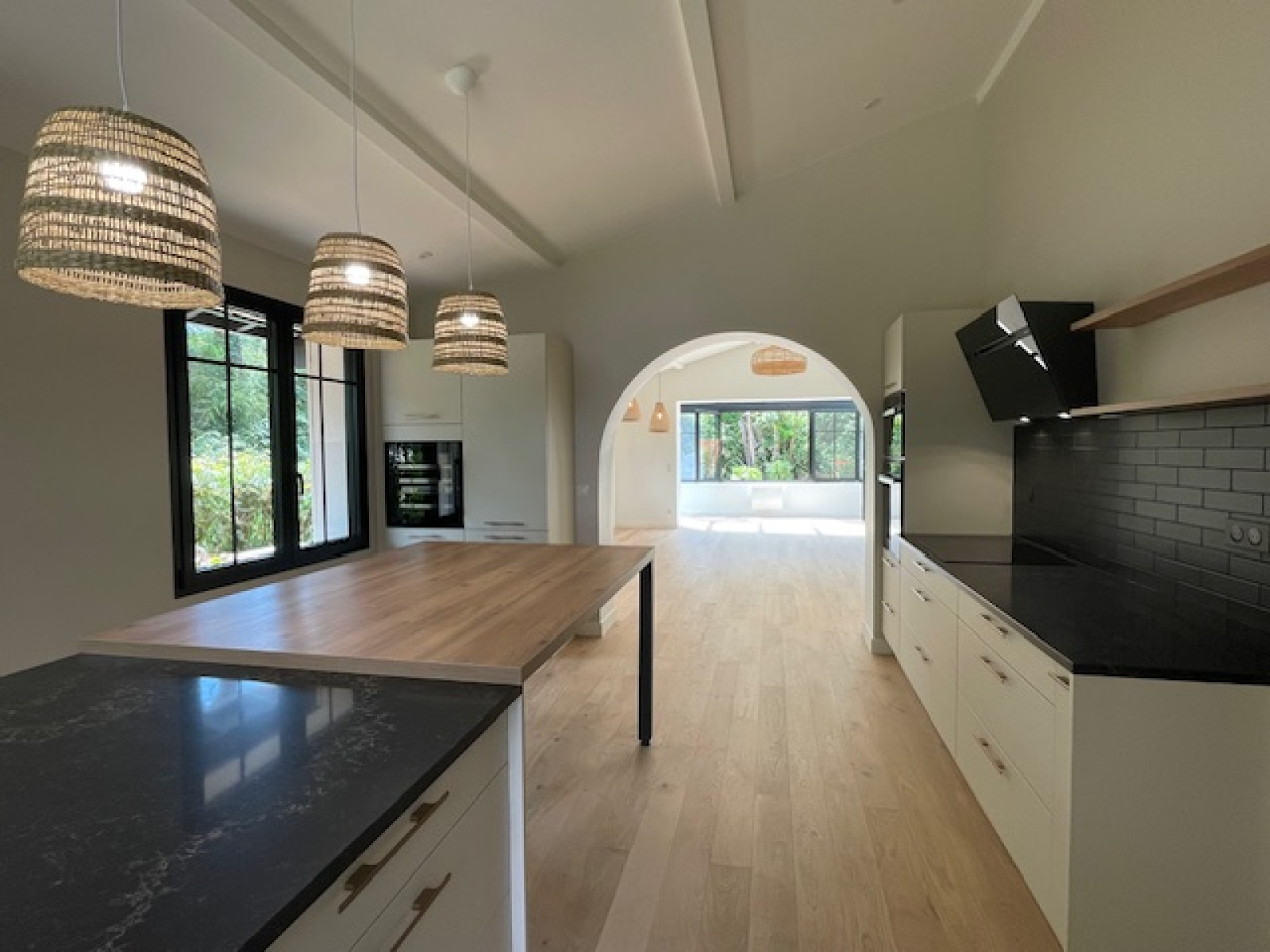 La réception de 69m² (salon-séjour-cuisine) est remarquable de part son volume et sa luminosité prolongée par une véranda, elle offre une vue imprenable sur la terrasse généreuse et le jardin superbement arboré.