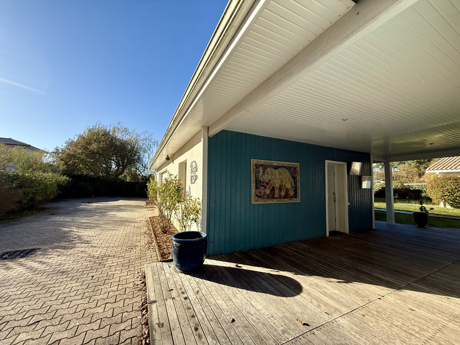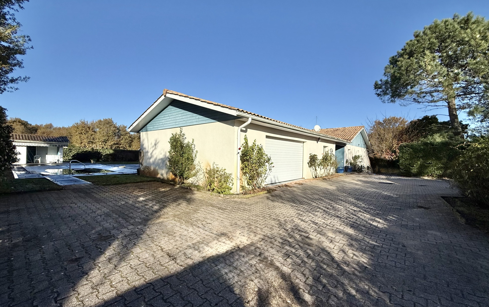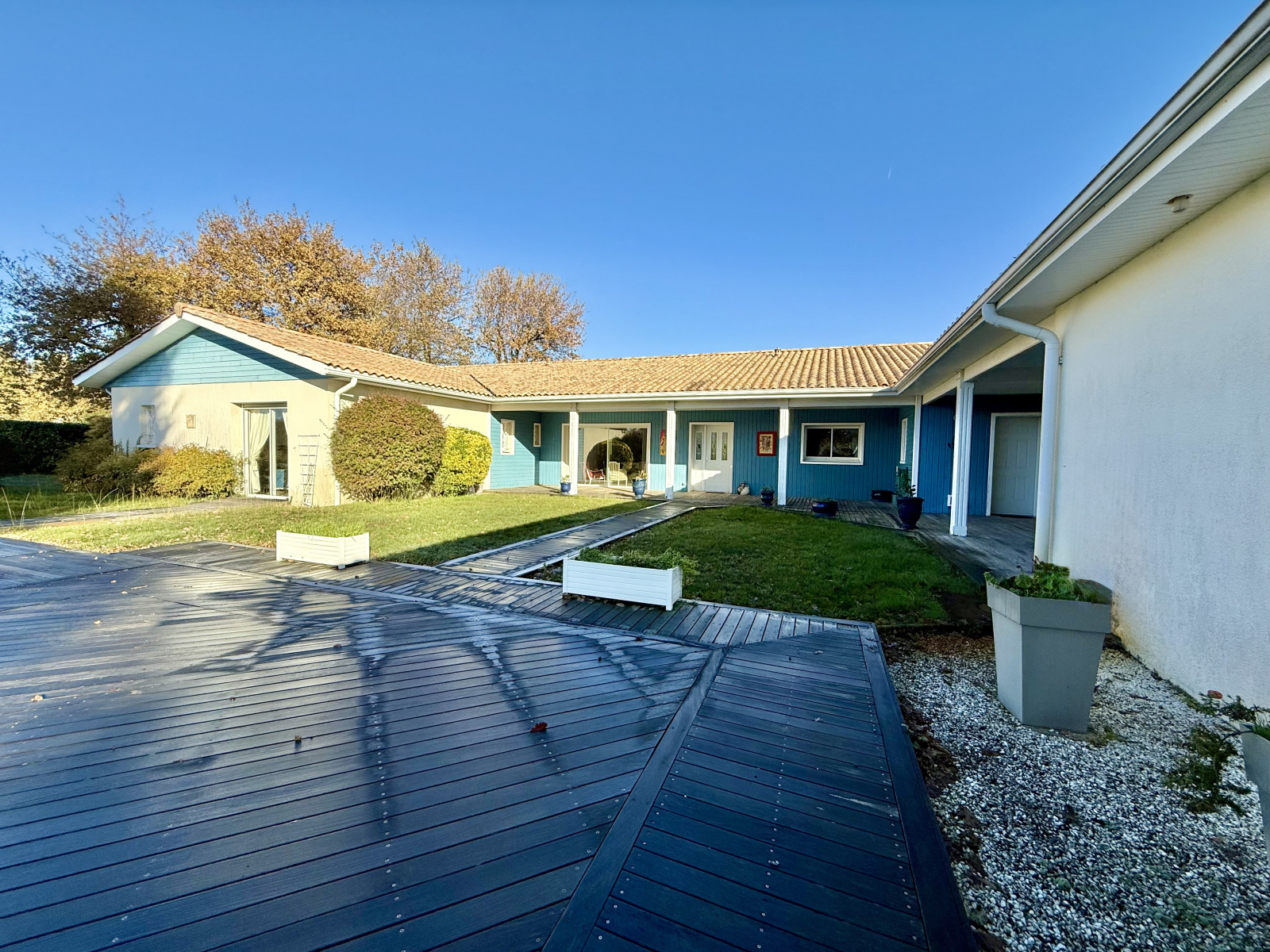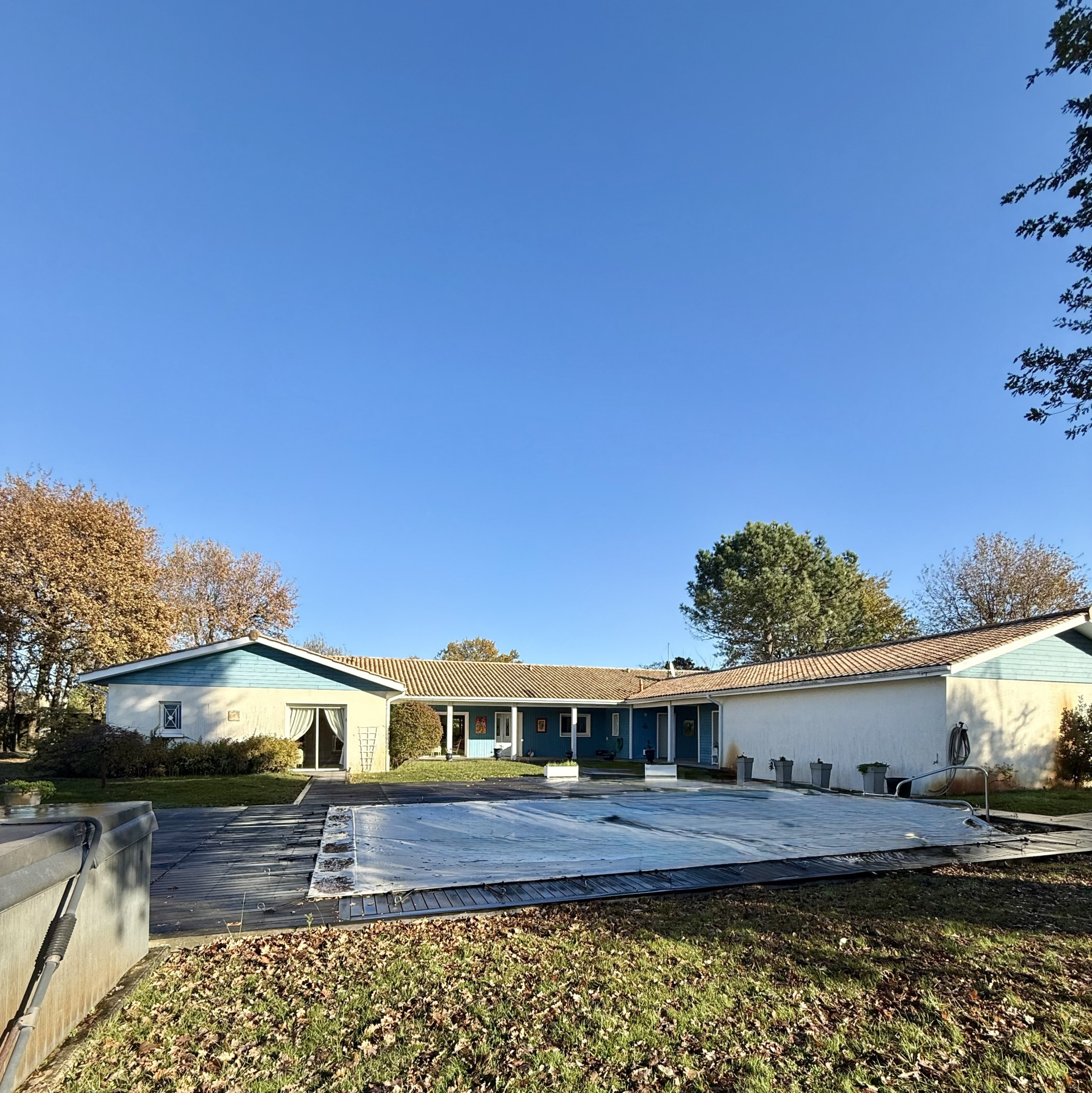 Gujan-Mestras (33470)Maison contemporaine de plain-pied, d'une surface habitable de 297 m² comprenant une réception avec une cheminée de 70 m² avec une véranda attenante et une cuisine équipée avec son cellier.